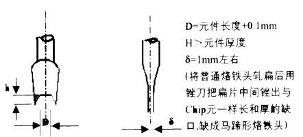(2)用與器件尺寸相匹配雙片扁鏟式馬蹄形烙鐵頭(可自制或采購,見圖12-3)同時加熱器件兩端所有引腳焊點。