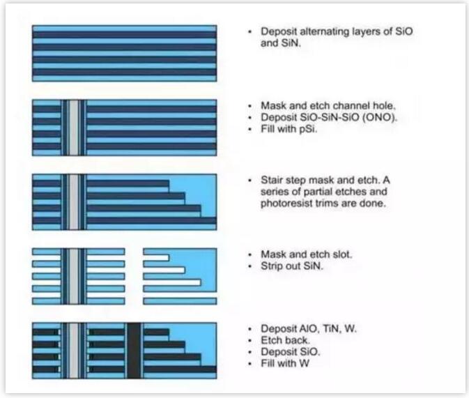 東芝開發(fā)了 Bit Cost Scalable(BiCS)的工藝。BiCS 工藝采用了一種先柵極方法(gate-first approach),這是通過交替沉積氧化物(SiO)層和多晶硅(pSi)層實(shí)現(xiàn)的。然后在這個(gè)層堆疊中形成一個(gè)通道孔,并填充氧化物-氮化物-氧化物(ONO)和 pSi。然后沉積光刻膠,通過一個(gè)連續(xù)的蝕刻流程,光刻膠修整并蝕刻出一個(gè)階梯,形成互連。最后再蝕刻出一個(gè)槽并填充氧化物。如下圖所示: