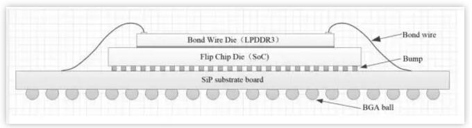 另一種常見的方式是將一顆倒裝焊(flip-chip)裸芯片安裝在SiP基板上,另外一顆裸芯片以鍵合的方式安裝在其上方,如下圖所示,這種3D解決方案在手機(jī)中比較常用。