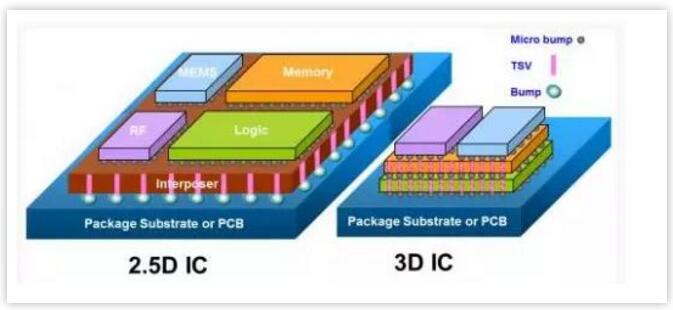 下圖顯示了無源TSV和有源TSV分別對應(yīng)的2.5D和3D技術(shù)。