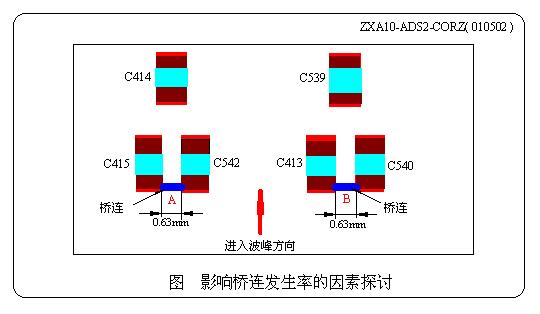 在上講中我們給出了一個(gè)討論題:C線在焊接工號(hào)為:ZXA10-ADS2-CORZ( 010502 )時(shí),基板上電容C415與C542、C413 與C540之間相鄰間隙均為0.63mm( <1.27mm,屬于設(shè)計(jì)不當(dāng)),用新噴嘴開雙波時(shí)在圖2所示的A、B二處百分之百地發(fā)生橋連現(xiàn)象,而僅開第二波進(jìn)行單波焊接時(shí),反而橋連發(fā)生率卻非常小。其實(shí)問題就出在助焊劑上,主要原因不外乎是: