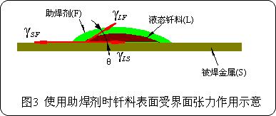 焊接中使用助焊劑可以清除釬料和被焊金屬表面的氧化膜,改善了潤濕。而且當(dāng)液態(tài)釬料和被焊金屬表面復(fù)蓋了一層助焊劑之后,它們之間的界面張力發(fā)生了變化,如圖3所示。