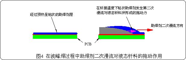 經(jīng)過預(yù)熱后的粘狀助焊劑與波峰釬料接觸后,活性劇增,粘度急劇下降而在被焊金屬表面形成第二次漫流,并迅速在被焊金屬表面鋪展開來。助焊劑第二次漫流過程所形成的漫流作用力,附加在液態(tài)釬料上從拖動(dòng)了液態(tài)金屬的漫流過程,如圖4所示。