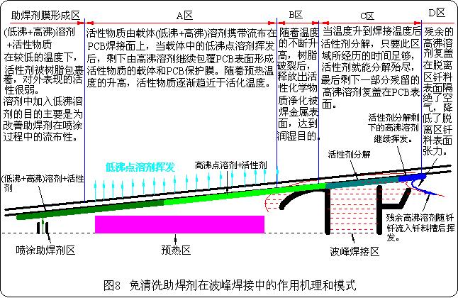 免清洗助焊劑在波峰焊接中的作用機(jī)理與模式的描述如圖8所示。